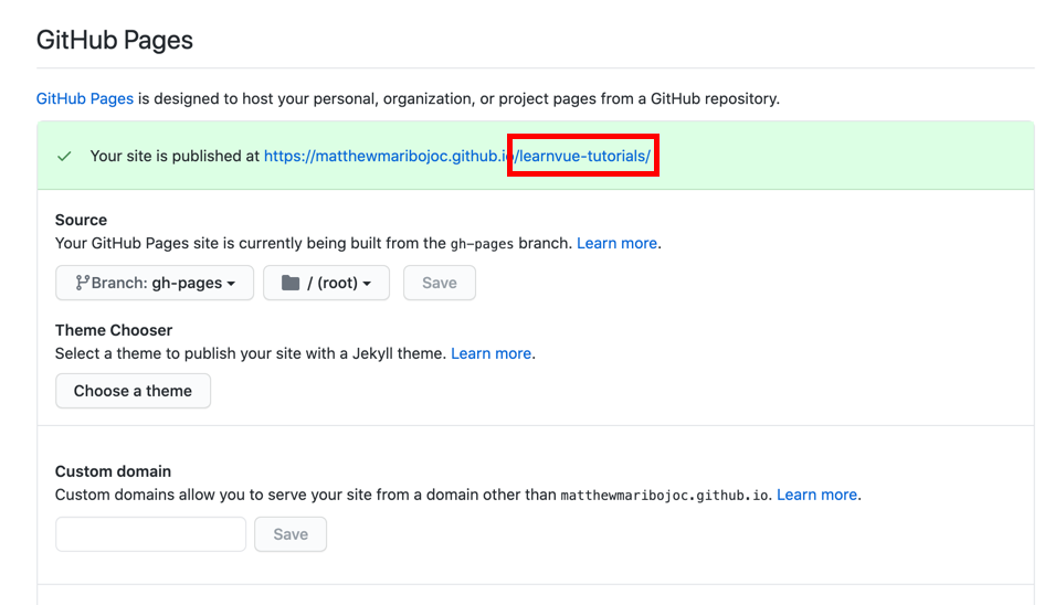 This means that all files on our gh-pages branch can be accessed at something like https://matthewmaribojoc.github.io/learnvue-tutorials/main.css – for example.