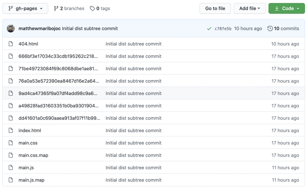 This step makes gh-pages a subtree of our master branch. The prefix option specifies the folder that we want for our the subtree. If we take a look at our gh-pages branch, we will see that it is equivalent to being the root of the dist folder.