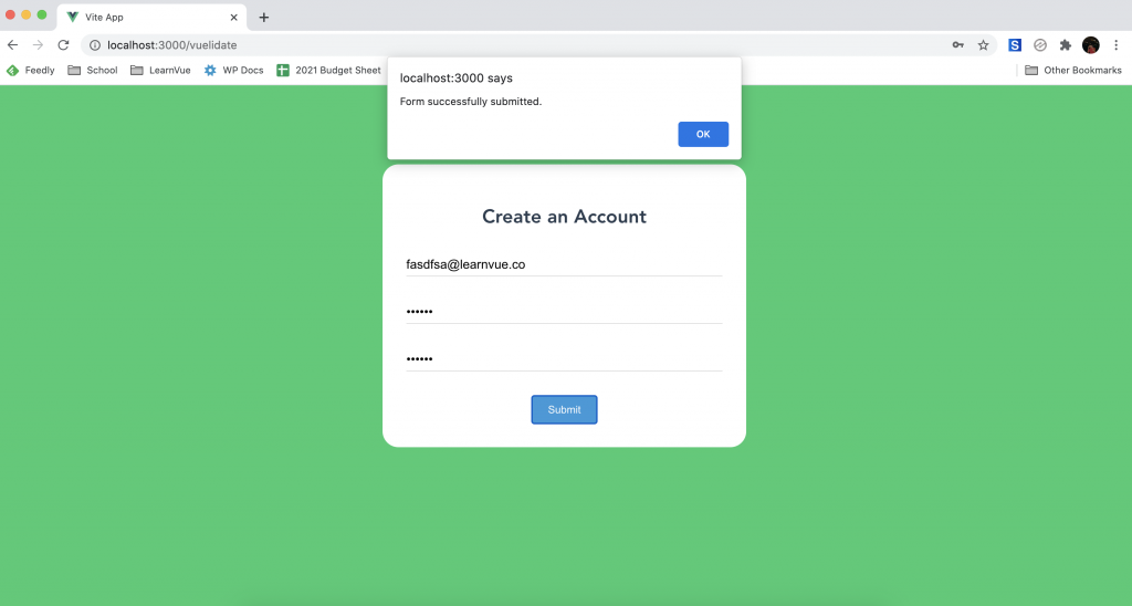 This is only a short list of the built in validators that Vuelidate offers. For a complete list, be sure to go to the Vuelidate docs.