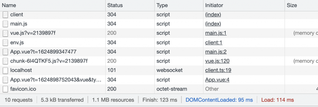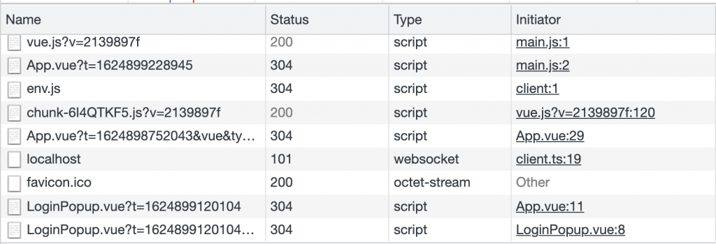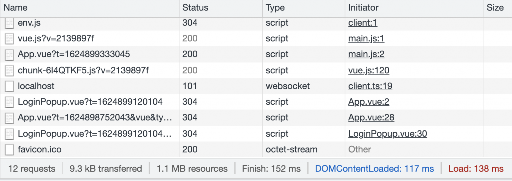 However, if we look at the same tab using defineAsyncComponent, we’ll notice that when our page loads, LoginPopup.vue is nowhere to be seen. This is because it hasn’t been loaded yet.