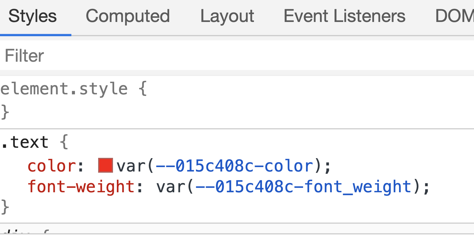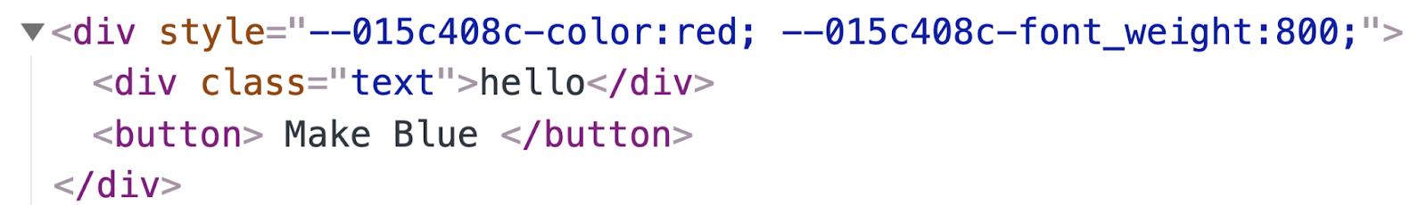 Written as normal CSS that looks something like this, where we are declaring CSS variables called --015c408c-color and setting it to red and --015c408c-font_weight and setting it to 800.