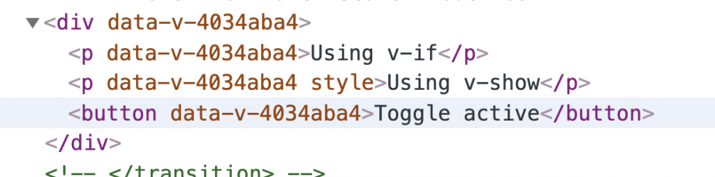 We can easily see these by running inspect element for both a v-if and a v-show. So let’s say we have the following code that has both types of conditionals and a button that toggles them.