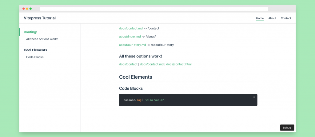 When writing good documentation, code examples are vital. VitePress provides a way to quickly add code blocks and also specify what programming language it’s using.
